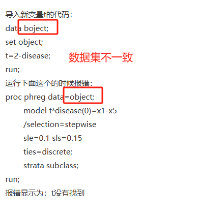 在SAS中,你可能遇到了一个常见问题,即你在数据集中创建了一个新变量`t`,但在后续的`proc phreg`步骤中,该变量未被正确识别。这种情况通常是因为`data`和`proc`步骤之间没有保持数据集的更新。