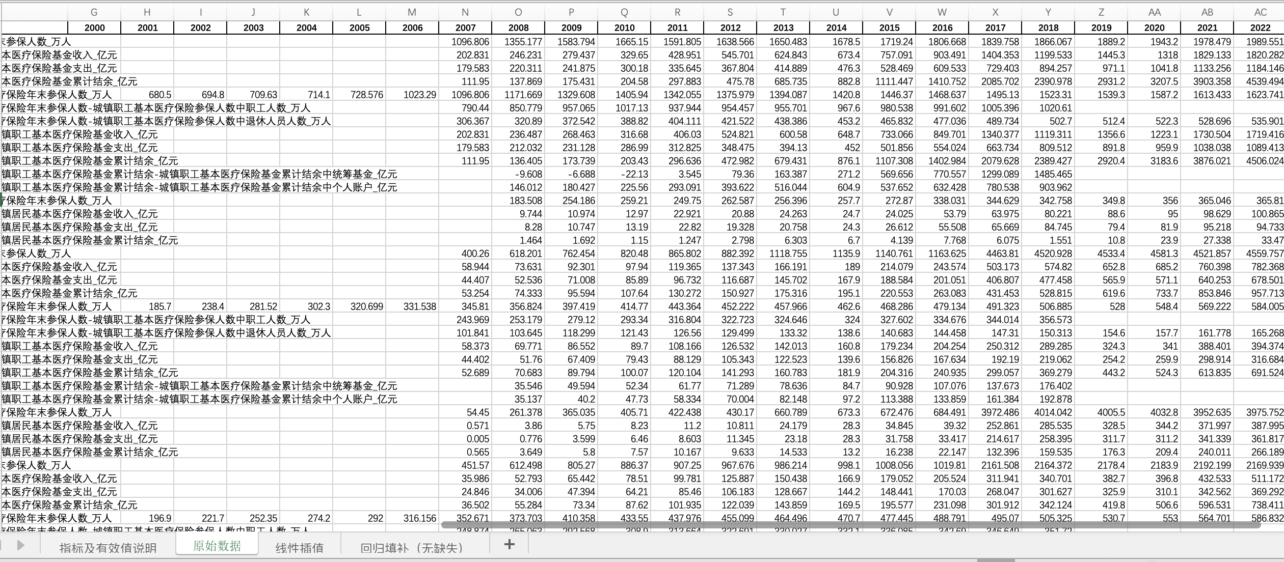 注意:我们把横跨23年年鉴的不同指标数据都罗列出来了,而每年年鉴口径客观变化情况,原始数据中存在披露口径缺失,其余非数据缺失,而是该年鉴口径没有统计。故提供线性插值及回归填补无缺失版本。
