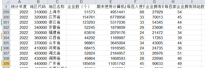 .数据指标:统计年度 地区代码 地区名称 企业数(个) 期末使用计算机数(台) 每百人使用计算机数(台) 企业拥有网站数(个) 每百家企业拥有网站数(个)