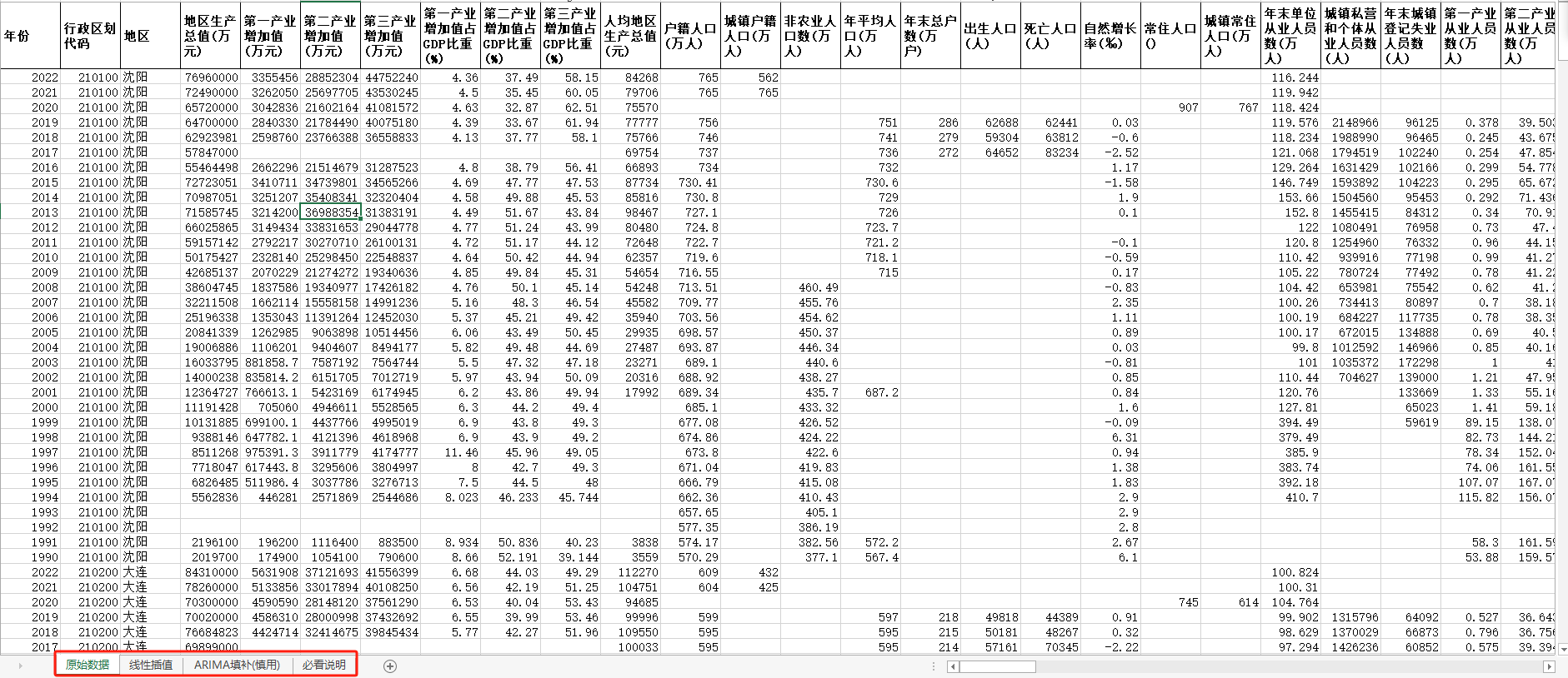 中国地级市面板统计数据库(包含四个页签:原始数据、线性插值、ARIMA填补三个页签)