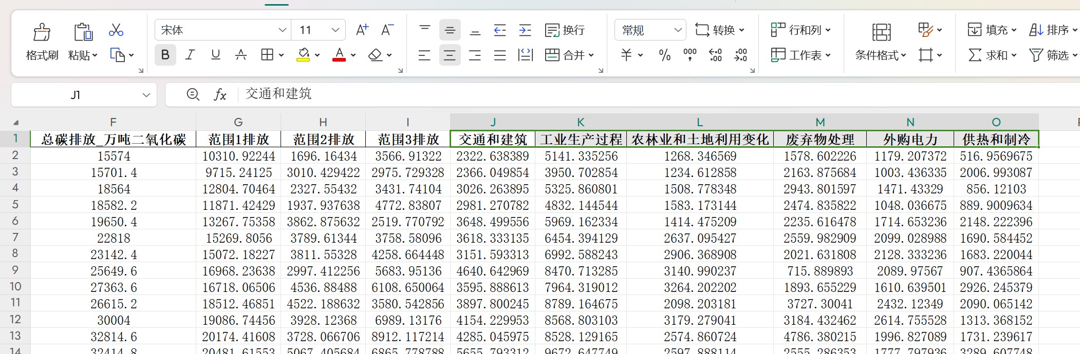 指标包括:总碳排放_万吨二氧化碳 范围1排放 范围2排放 范围3排放 交通和建筑 工业生产过程 农林业和土地利用变化 废弃物处理 外购电力 供热和制冷
