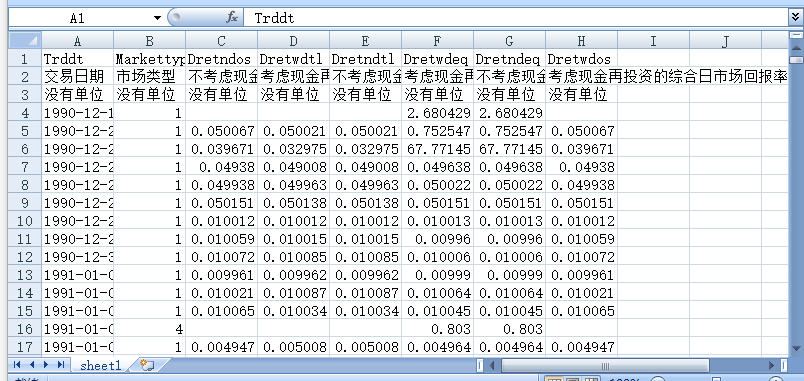 Dretndtl [不考虑现金再投资的综合日市场回报率(总市值加权平均法)] - 表示数据库的第一条记录,即市场开市首日,字段说明见说明书“2.2 市场回报率的计算”