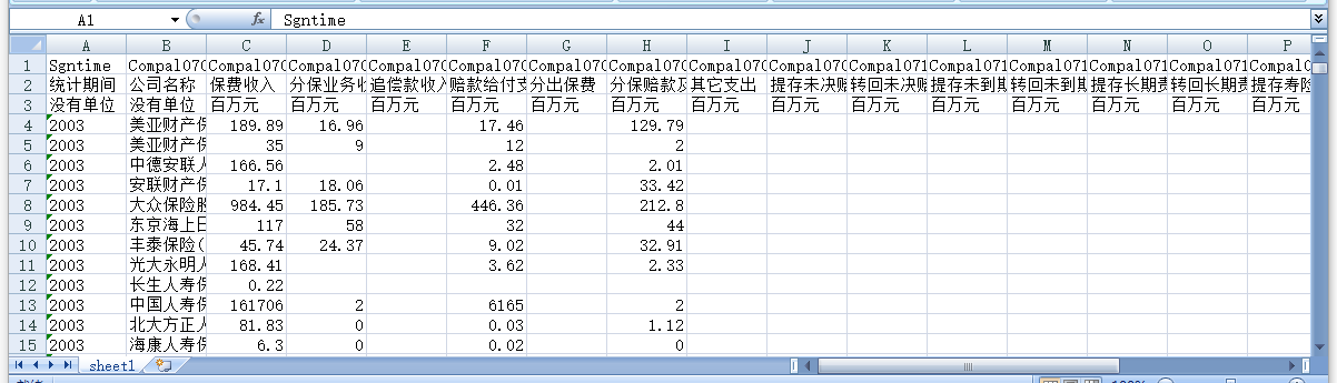统计期间 公司名称 保费收入 分保业务收入 追偿款收入 赔款给付支出 分出保费 分保赔款及费用支出 其它支出 提存未决赔款准备金 转回未决赔款准备金 提存未到期责任准备金 转回未到期责任准备金 提存长期责任准备金 转回长期责任准备金 提存寿险责任准备金 转回寿险责任准备金 提存长期健康险责任准备金 转回长期健康险责任准备金 承保利润 营业利润 利润总额 净利润