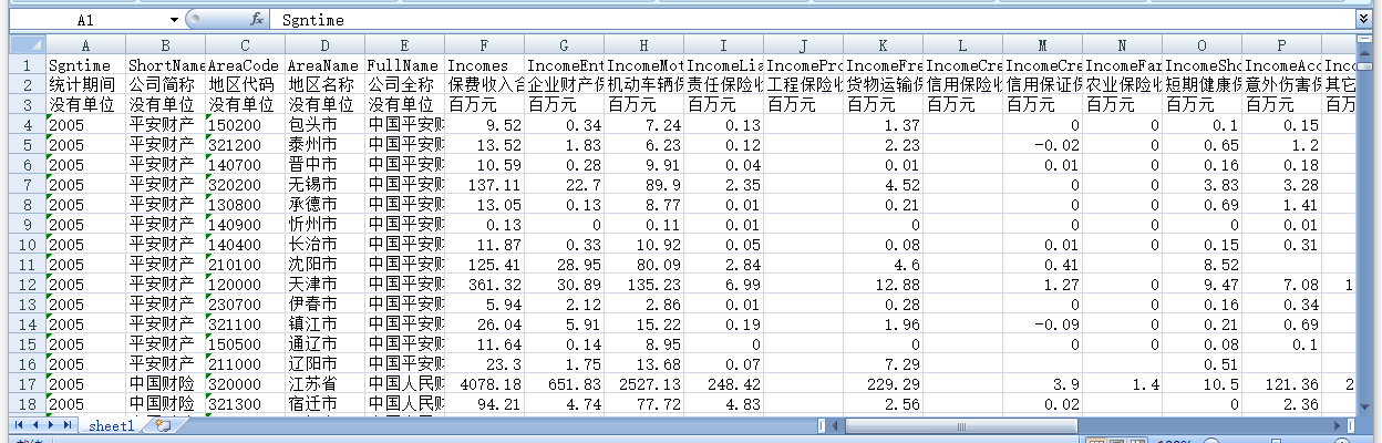 统计期间 公司简称 地区代码 地区名称 公司全称 保费收入合计 企业财产保险收入 机动车辆保险收入 责任保险收入 工程保险收入 货物运输保险收入 信用保险收入 信用保证保险合计收入 农业保险收入 短期健康保险收入 意外伤害保险收入 其它保险收入 保户储金 保户储金及投资款 赔款支出合计 企业财产保险支出 机动车辆保险支出 责任保险支出 工程保险支出 货物运输保险支出 信用保险支出 信用保证保险合计支出 农业保险支出 短期健康保险支出 意外伤害保险支出 其它保险支出 赔案件数 未决赔款