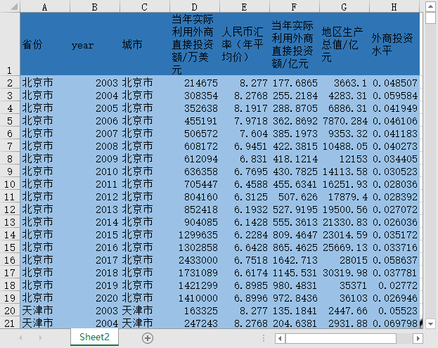 省份 year 城市 当年实际利用外商直接投资额/万美元 人民币汇率(年平均价) 当年实际利用外商直接投资额/亿元 地区生产总值/亿元 外商投资水平