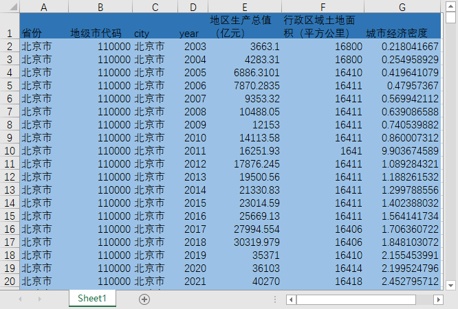 全国297个地级市城市2003-2021地区生产总值GDP行政区域土地面积城市经济密度省份.xlsx