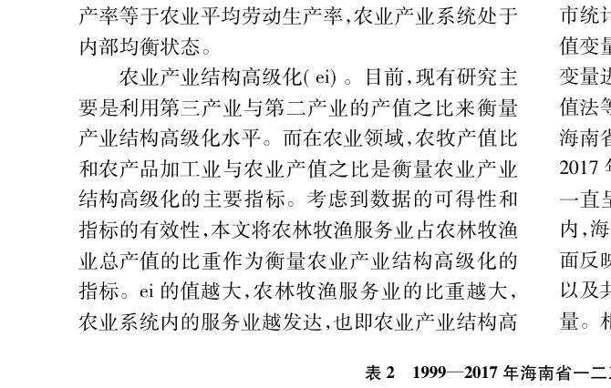 指标的有效性,本文将农林牧渔服务业占农林牧渔业总产值的比重作为衡量农业产业结构高级化的指标。ei的值越大,农林牧渔服务业的比重越大,农业系统内的服务业越发达,也即农业产业结构高级化越高。