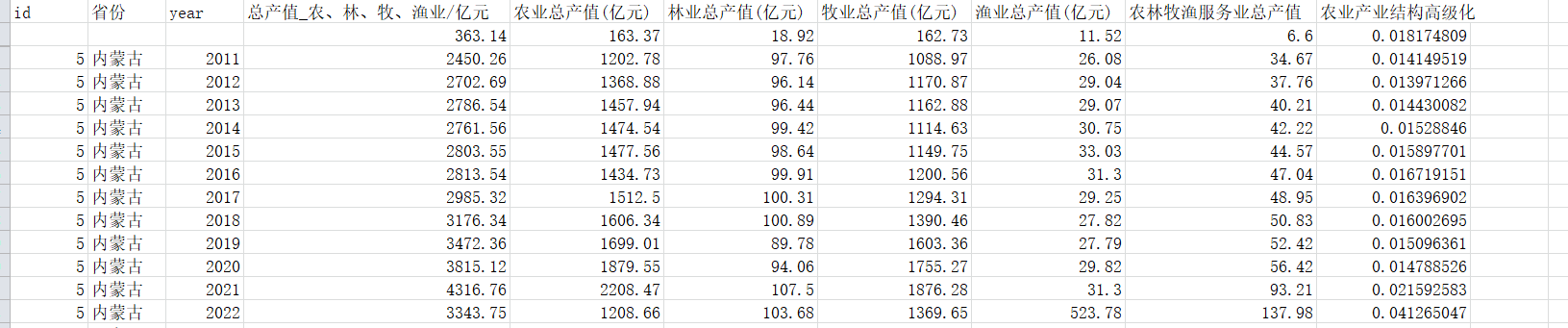 3.资料范围:省级数据,具体指标为id 省份 year 总产值_农、林、牧、渔业/亿元 农业总产值(亿元) 林业总产值(亿元) 牧业总产值(亿元) 渔业总产值(亿元) 农林牧渔服务业总产值 农业产业结构高级化