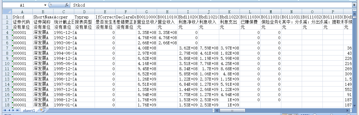 证券代码 证券简称 统计截止日期 报表类型 是否发生差错更正 差错更正披露日期 营业总收入 营业收入 利息净收入 利息收入 利息支出 已赚保费 保险业务收入 其中:分保费收入 减:分出保费 减:提取未到期责任准备金 手续费及佣金净收入 其中:代理买卖证券业务净收入 其中:证券承销业务净收入 其中:受托客户资产管理业务净收入 手续费及佣金收入 手续费及佣金支出 其他业务收入 营业总成本 营业成本 退保金 赔付支出净额 赔付支出 减:摊回赔付支出 提取保险责任准备金净额 提取保险责任准备金 减:摊回保险责任准备金 保单红利支出 分保费用 税金及附加 业务及管理费 减:摊回分保费用 保险业务手续费及佣金支出 销售费用 管理费用 研发费用 财务费用 其中:利息费用(财务费用) 其中:利息收入(财务费用) 其他收益 投资收益 其中:对联营企业和合营企业的投资收益 其中:以摊余成本计量的金融资产终止确认收益 汇兑收益 净敞口套期收益 公允价值变动收益 资产减值损失 信用减值损失 资产处置收益 其他业务成本 其他业务利润 营业利润 加:营业外收入 其中:非流动资产处置利得 减:营业外支出 其中:非流动资产处置净损益 其中:非流动资产处置损失 利润总额 减:所得税费用 未确认的投资损失 影响净利润的其他项目 净利润 归属于母公司所有者的净利润 归属于母公司其他权益工具持有者的净利润 少数股东损益 基本每股收益 稀释每股收益 其他综合收益(损失) 综合收益总额 归属于母公司所有者的综合收益 归属于母公司其他权益工具持有者的综合收益总额 归属少数股东的综合收益