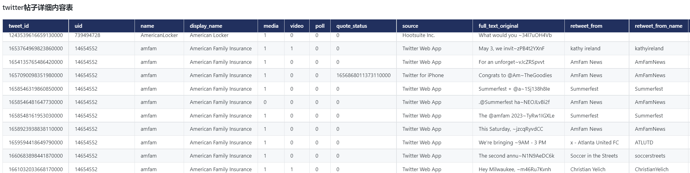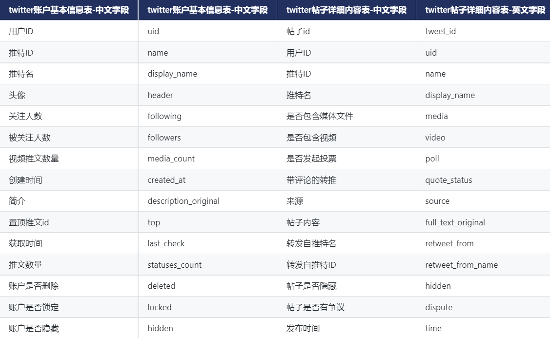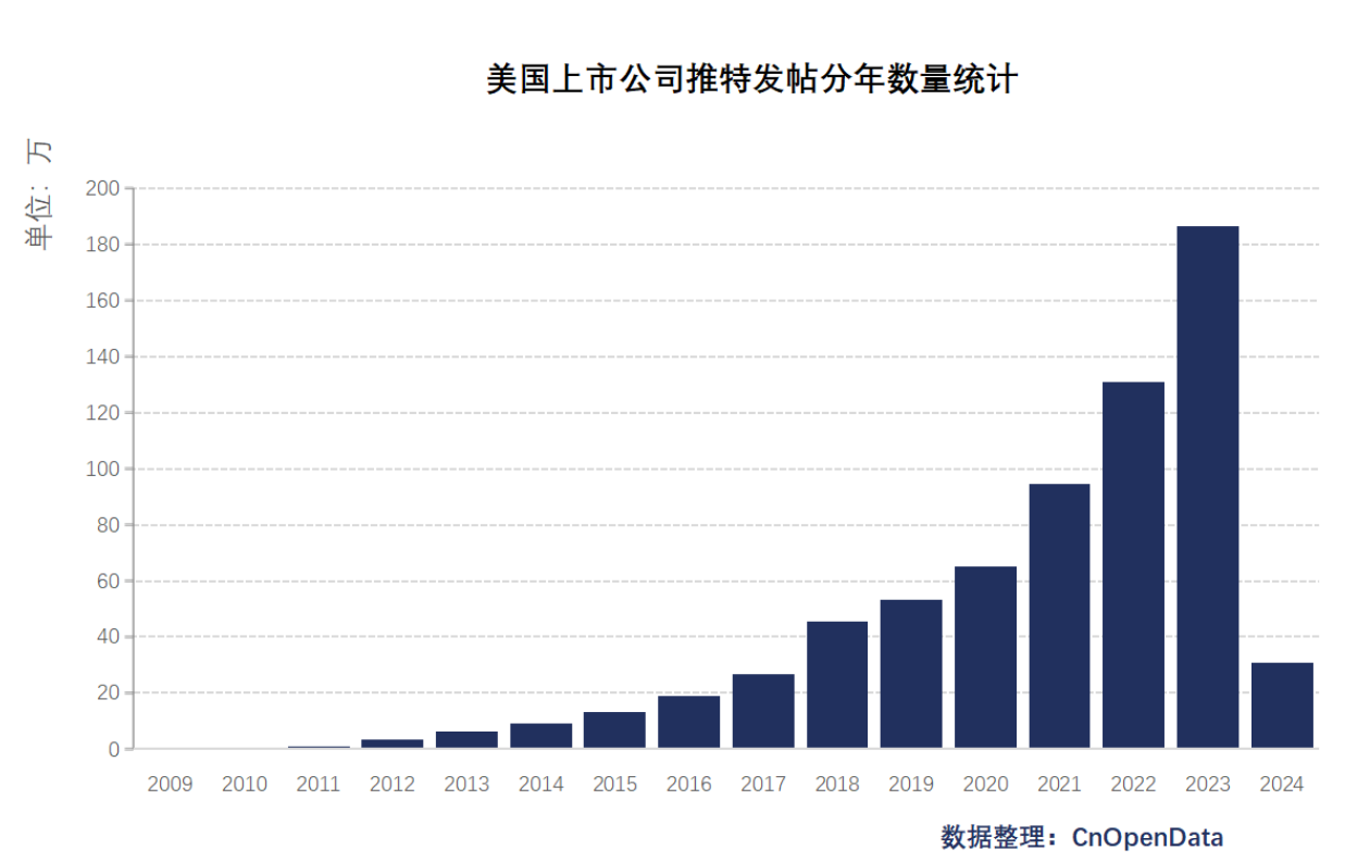 CnOpenData美国上市公司Twitter账户详情数据通过关键字检索整理了美国上市公司相关的账户信息,分为twitter账户基本信息表、twitter帖子详细内容表2张表,涵盖用户ID、推特ID、推特名、(被)关注人数、推文数量、简介、创建时间、账户情况、帖子内容、帖子发布时间等字段,对相关研究提供了有力的数据支持。