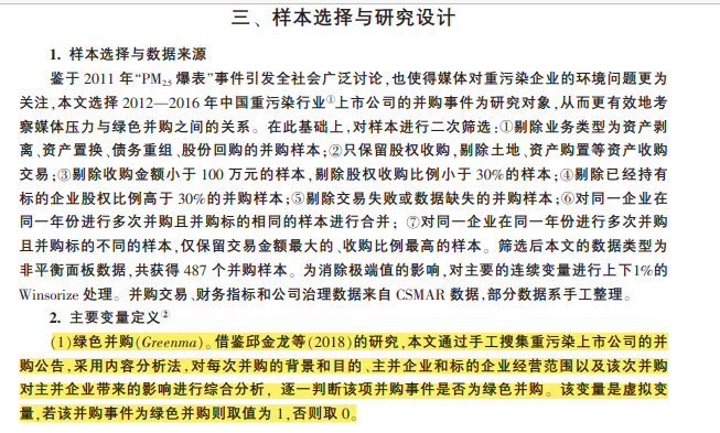 参照:[1]潘爱玲,刘昕,邱金龙,等.媒体压力下的绿色并购能否促使重污染企业实现实质性转型[J].中国工业经济,2019,(02):174-192.DOI:10.19581/j.cnki.ciejournal.20190131.005.中做法: