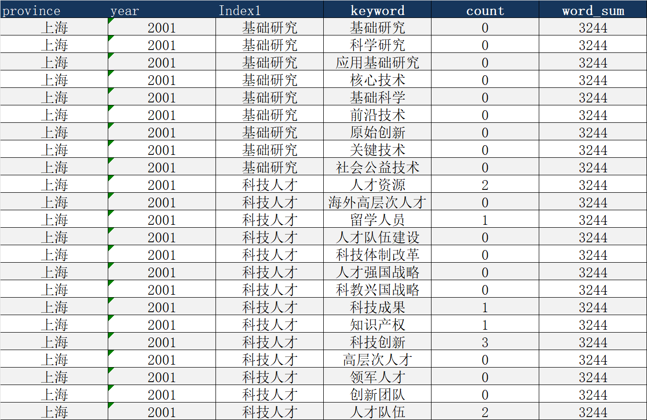 数据名称:01-24年各省份科技发展及人才资源注意力指标-政府科技人才注意力文本词频指标