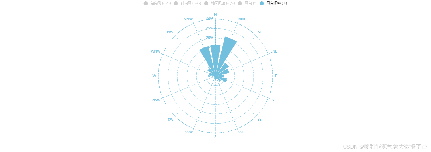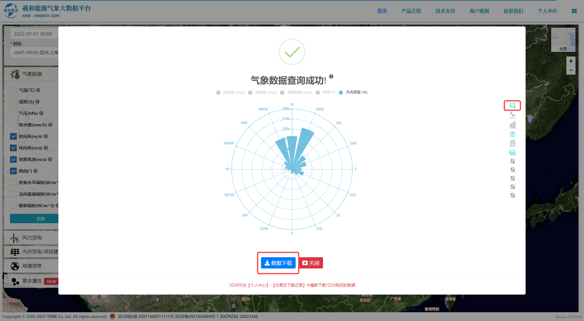 这里为需求者提供一共可以一键获取到玫瑰风向图的气象专业平台——羲和能源气象大数据平台。平台可以根据用户选取位置,下载该地点的指定时间段的历史40年到未来7天的小时级别气象数据。选择指定地理位置(支持对话框搜索、地图点击选取或经纬度坐标选取等方式),确定所需数据的起止时间,选择数据源,就可以下载气温、湿度、气压、降水量、经向风、纬向风、地面风速、风向、地表水平辐射、直接辐射、散射辐射共11类气象数据。