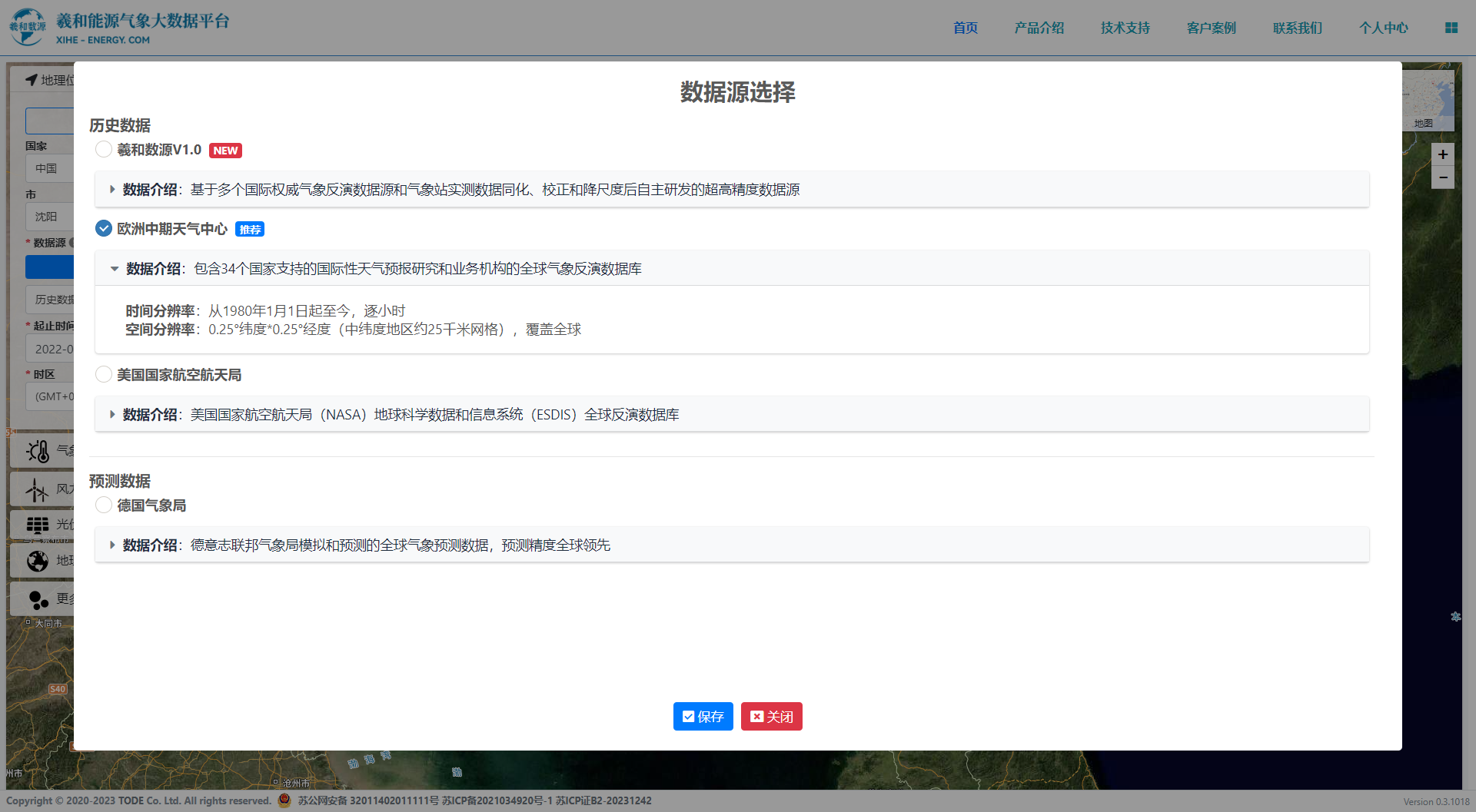 二、确认数据源,历史数据可选择羲和数源、欧洲中期天气中心、NASA;预测数据可选择德国气象局