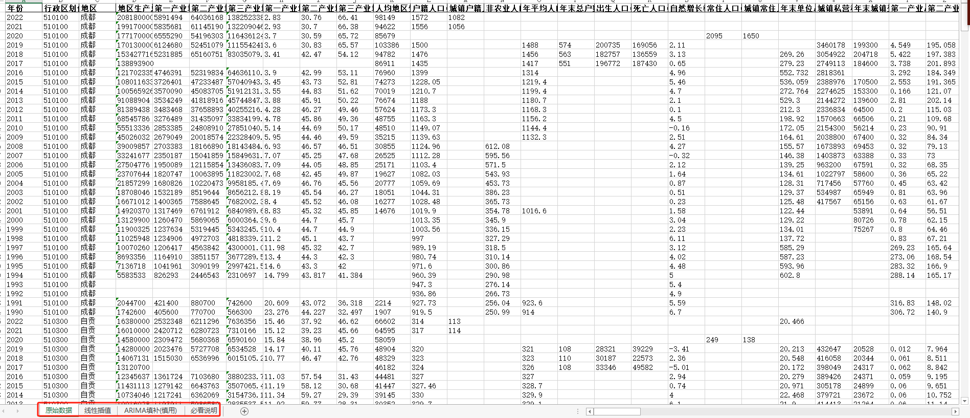 中国地级市面板统计数据库(包含四个页签:原始数据、线性插值、ARIMA填补三个页签)