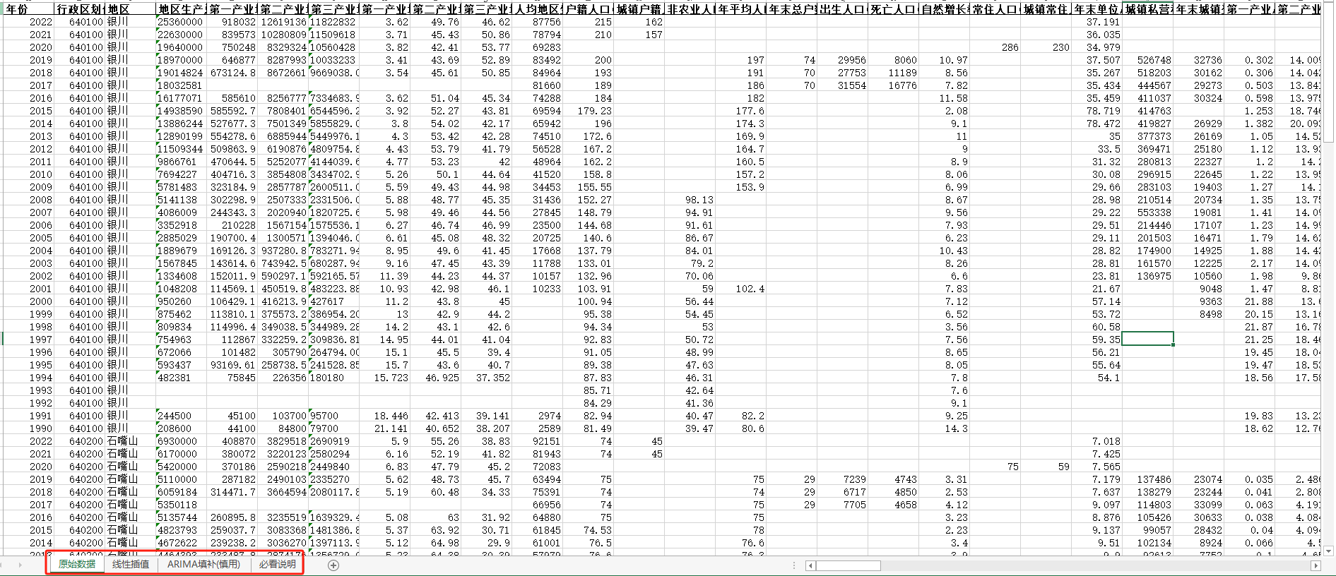 中国地级市面板统计数据库(包含四个页签:原始数据、线性插值、ARIMA填补三个页签)