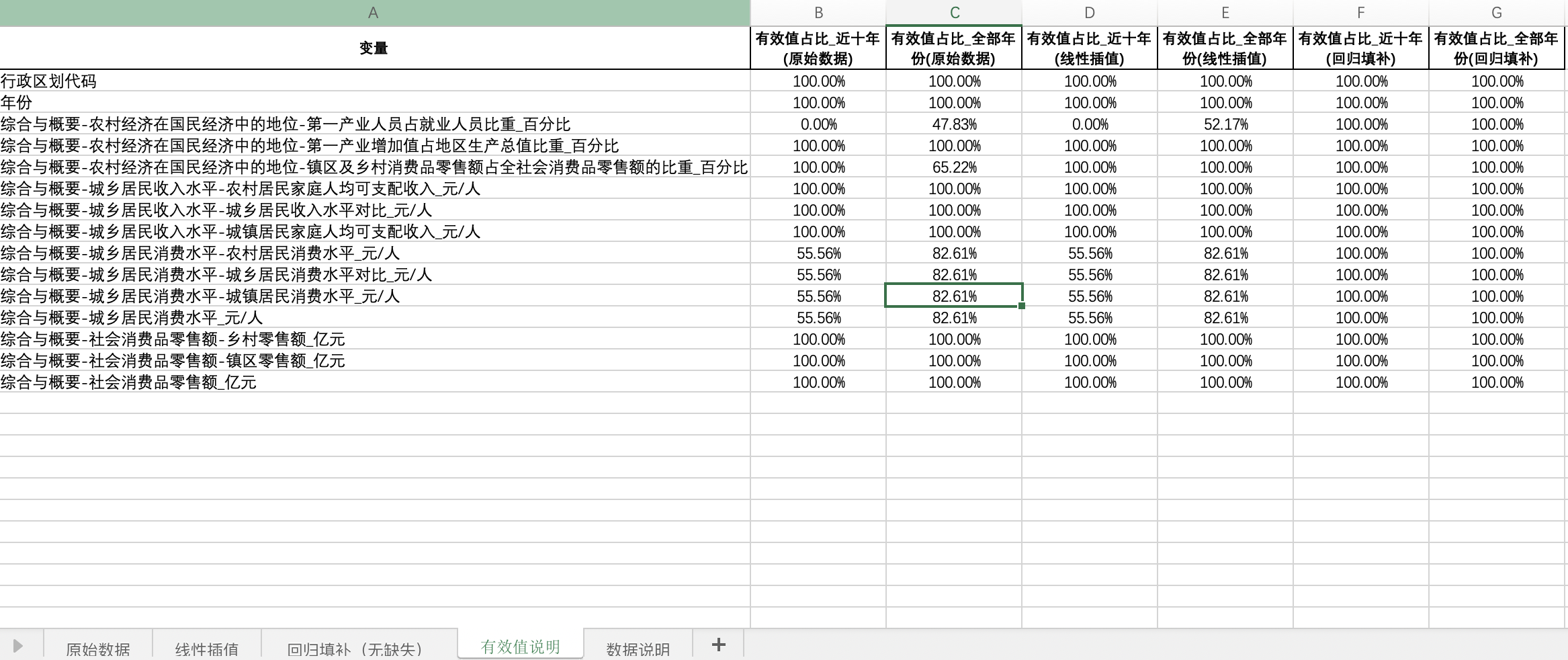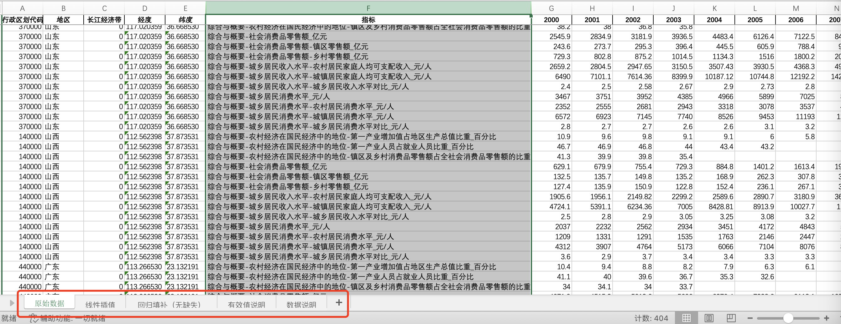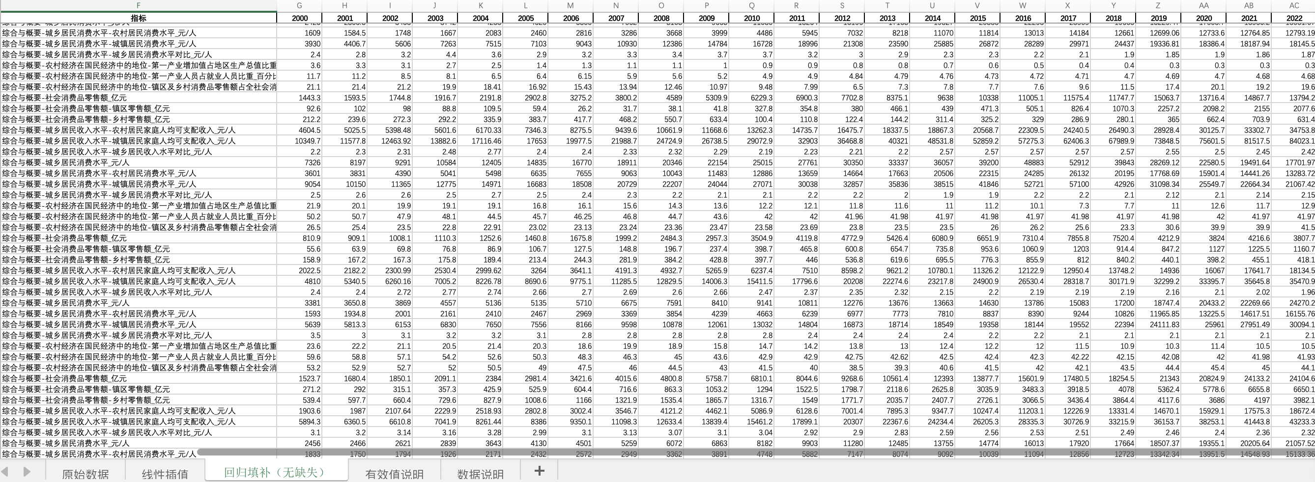 数据格式:Excel面板数据含原始数据(由于多年度指标不同存在缺失值)、线性插值、回归填补(无缺失)三个版本,提供您参考使用。其中,回归填补无缺失值。