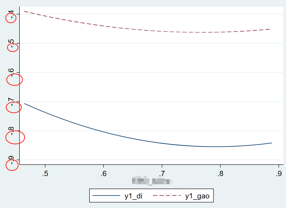 主效应是U相关,调节效应起到抑制的作用,但是图像画出来之后只能微弱地看出来曲线更加平缓了,并且两条线离得太远难以看出对比的差异。