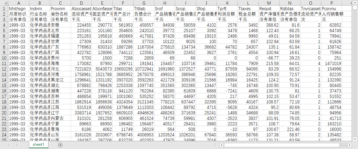 月度标识 行业名称 省份名称 流动资产平均余额 固定资产净值平均余额 资产总计 负债合计 产品销售收入 产品销售成本 产品销售费用 利润总额 税金总额 资产净值增长率(%) 资产负债率(%) 流动资产周转速度 人均销售额