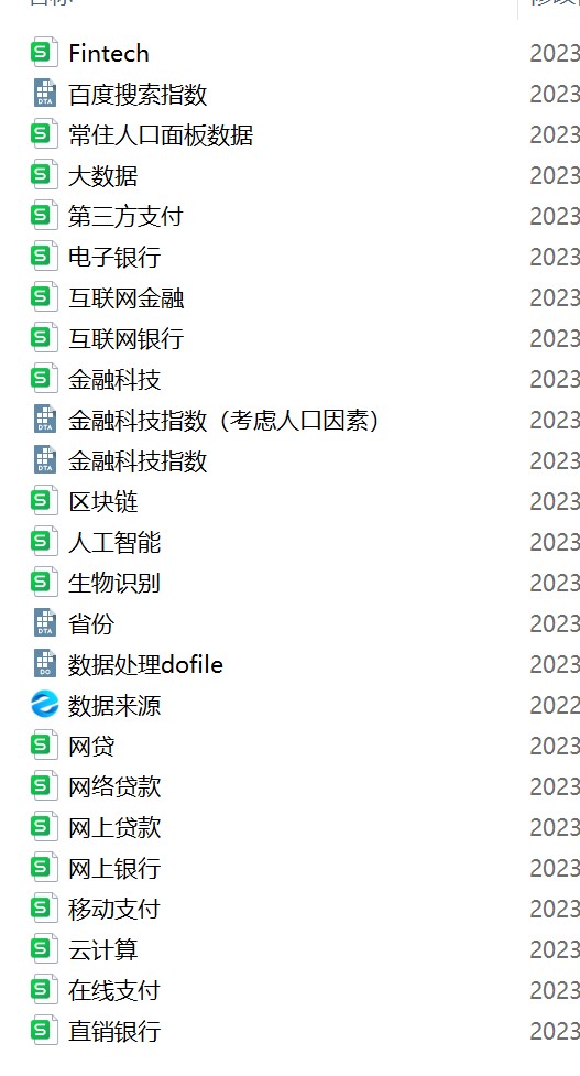 三、数据文件金融科技指数.dta; 金融科技指数(考虑人口因素).dta;Fintech.xlsx; 云计算.xlsx; 互联网金融.xlsx; 互联网银行.xlsx; 人工智能.xlsx; 区块链.xlsx; 在线支付.xlsx; 大数据.xlsx; 常住人口面板数据.xlsx; 数据处理dofile.do; 生物识别.xlsx; 电子银行.xlsx; 百度搜索指数.dta; 直销银行.xlsx; 省份.dta; 移动支付.xlsx; 第三方支付.xlsx; 网上贷款.xlsx; 网上银行.xlsx; 网络贷款.xlsx; 网贷.xlsx; 金融科技.xlsx;参考文献-金融科技、最优银行业市场结构与小微企业信贷供给_盛天翔.pdf
