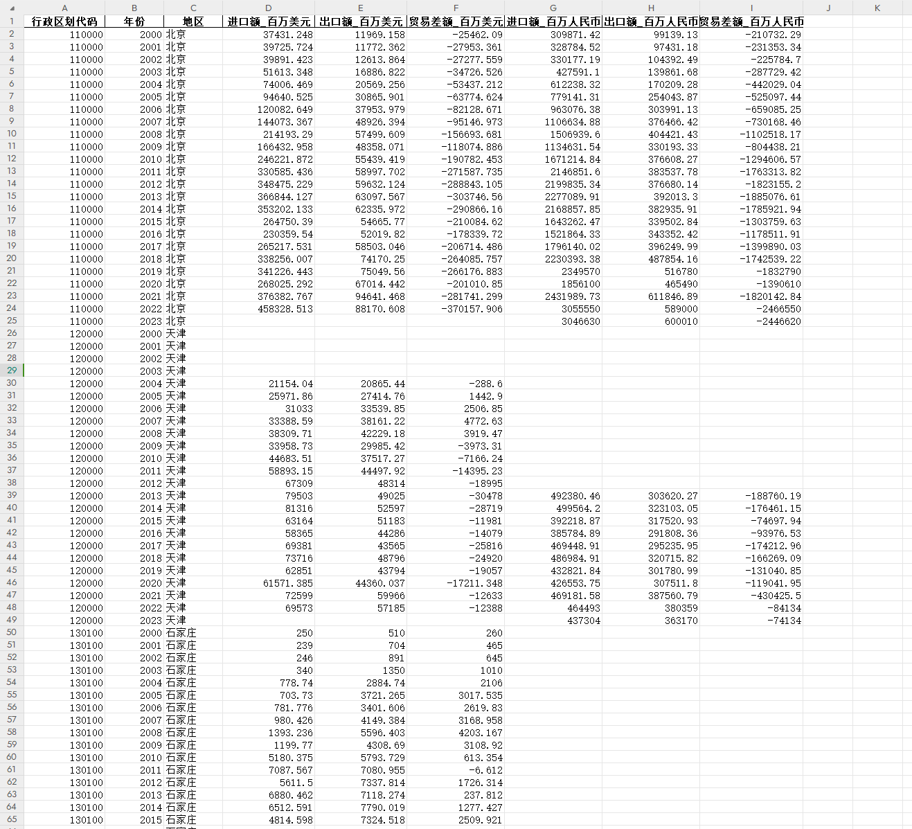 一、数据介绍数据名称:地级市-进出口、贸易差额数据