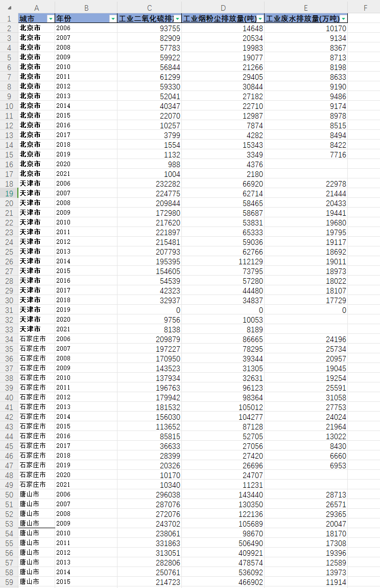 城市、年份、工业二氧化硫排放量(吨)-全市、工业烟粉尘排放量(吨)-全市、工业废水排放量(万吨)。