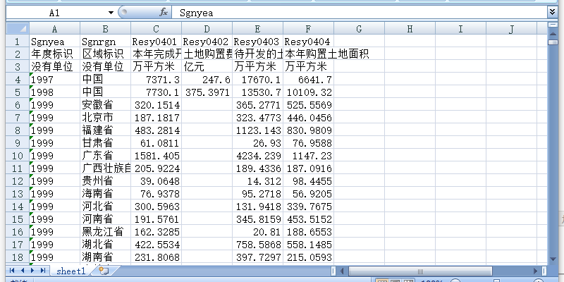 年度标识 区域标识 本年完成开发土地面积 土地购置费用 待开发的土地面积 本年购置土地面积