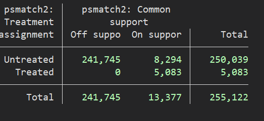 在这种情况下,PSM-DID的结果可能存在偏差。由于处理组样本全部在共同支撑域内而控制组有大量样本不在,这表明匹配可能不充分或者匹配质量不高。共同支撑假设要求处理组和控制组在匹配变量上具有重叠的分布,以便进行有效的比较。当匹配质量不佳时,匹配结果可能会对估计产生影响,导致稳健性降低。