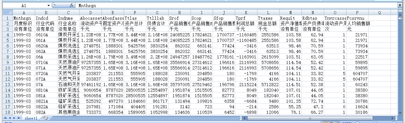月度标识 行业代码 行业名称 流动资产平均余额 固定资产净值平均余额 资产总计 负债合计 产品销售收入 产品销售成本 产品销售费用 利润总额 税金总额 资产净值增长率(%) 资产负债率(%) 流动资产周转速度 人均销售额