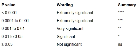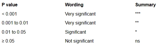 许多科学家不那么死板,所以更喜欢用“非常重要”或“极其重要”这样的形容词。Prism使用这种方法,如下表所示。这些定义并不完全是标准的。如果以这种方式报告结果,则应该在图例中定义符号。