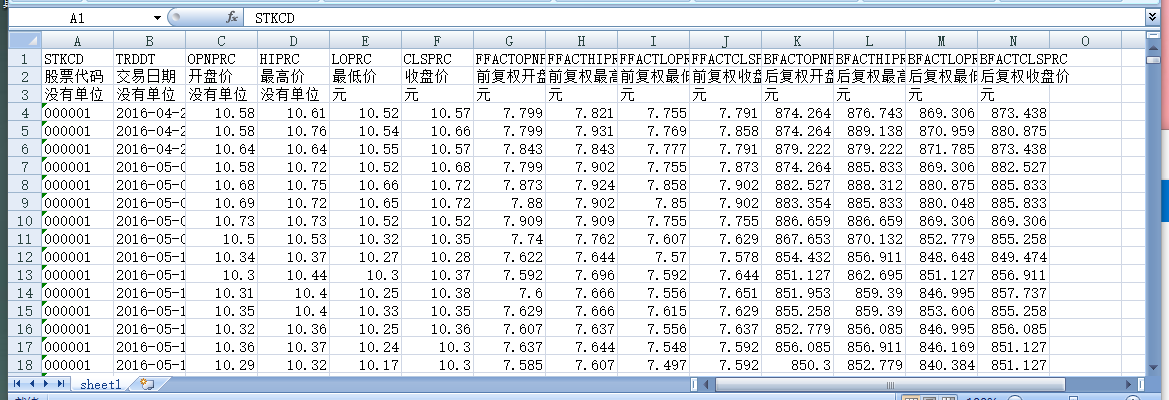 股票代码 交易日期 开盘价 最高价 最低价 收盘价 前复权开盘价 前复权最高价 前复权最低价 前复权收盘价 后复权开盘价 后复权最高价 后复权最低价 后复权收盘价
