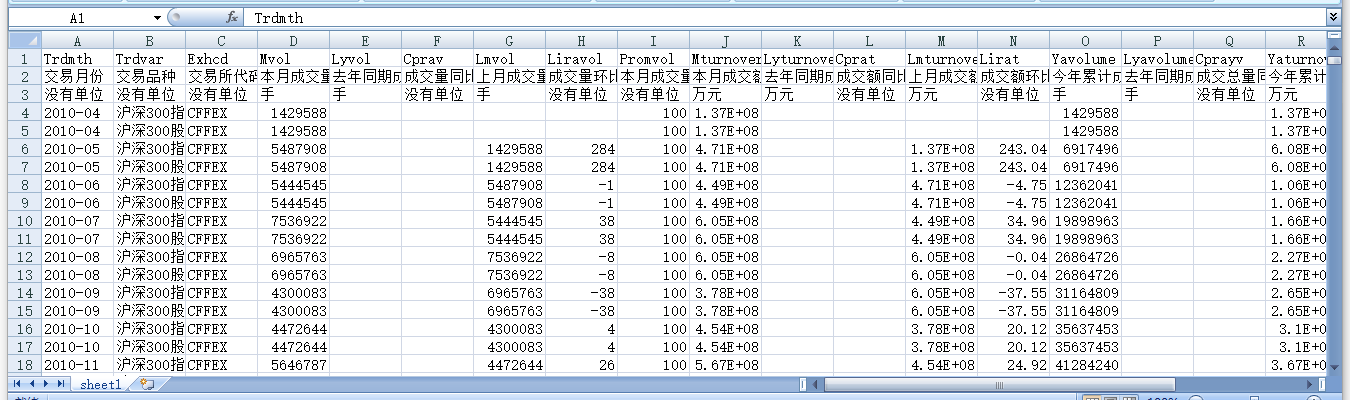 交易月份 交易品种 交易所代码 本月成交量 去年同期成交量 成交量同比增减(%) 上月成交量 成交量环比增减(%) 本月成交量占全国份额(%) 本月成交额 去年同期成交额 成交额同比增减(%) 上月成交额 成交额环比增减(%) 今年累计成交总量 去年同期成交总量 成交总量同比增减(%) 今年累计成交总额 去年同期成交总额 成交总额同比增减(%) 本月月末持仓量 上月月末持仓量 持仓量环比增减(%)