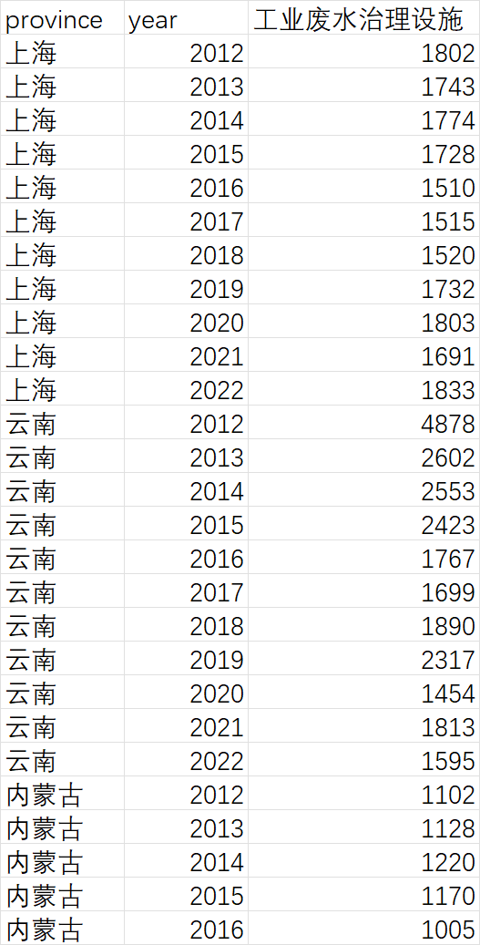数据名称:各省份环境治理水平衡量指标12-22年工业废水治理设施数量数据