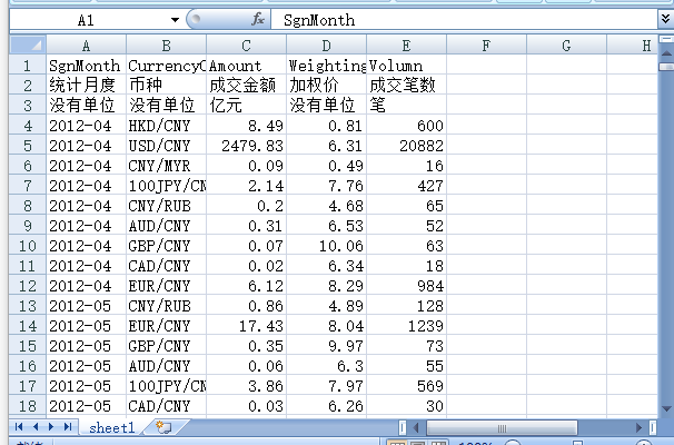 货币市场交易人民币外汇即期月报(月)2012-202403成交金额加权价成交笔数