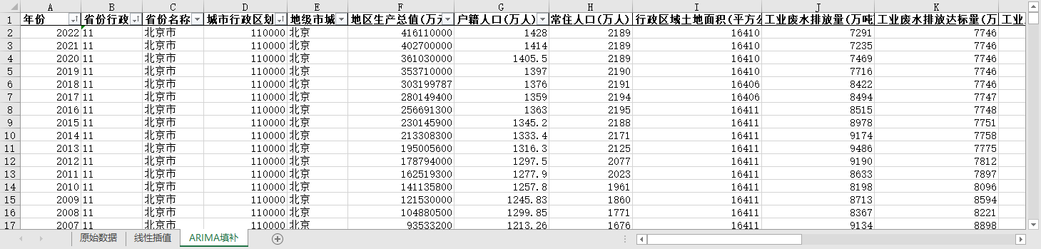 excel数据文件包原始数据(由于多年度指标不同存在缺失值)、线性插值、ARIMA填补三个版本,提供您参考使用。