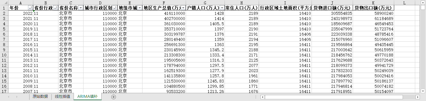 excel数据文件包原始数据(由于多年度指标不同存在缺失值)、线性插值、ARIMA填补三个版本,提供您参考使用。