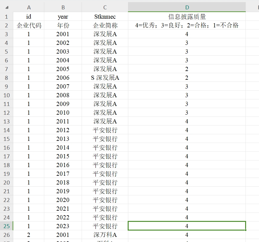 取值为4、3、2、1,值越大,企业信息披露质量越高。4等于A等于优秀,3等于B等于良好.....