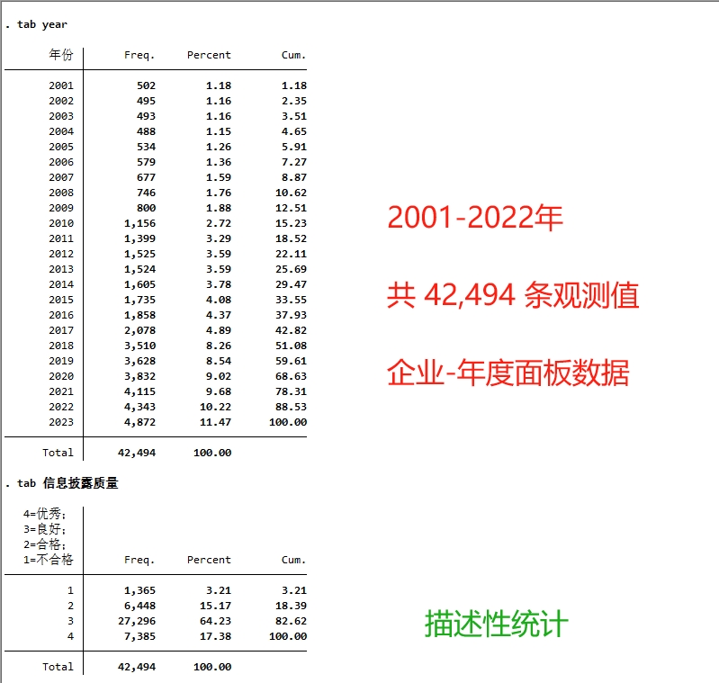 范围:2001 - 2023 年,共 42,494 条观测值,沪深A股上市公司