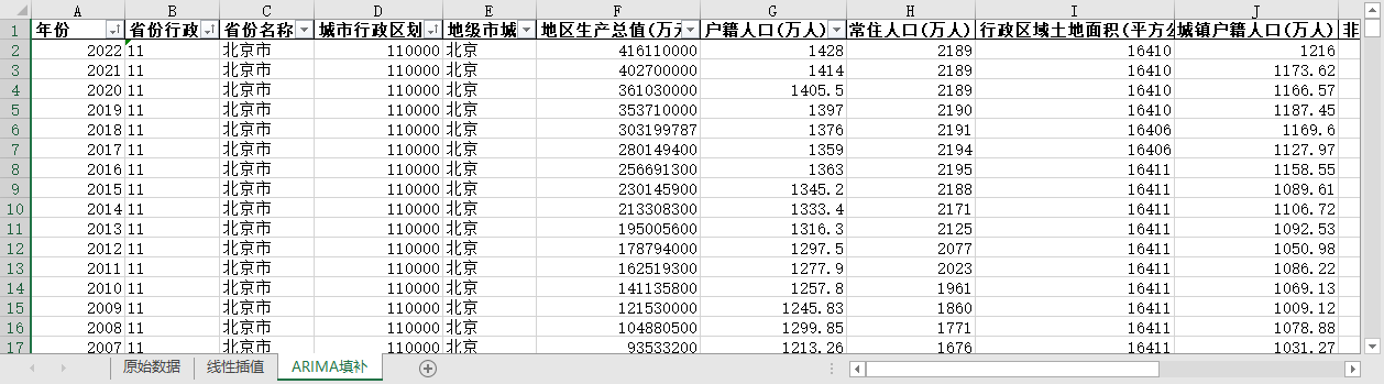excel数据文件包原始数据(由于多年度指标不同存在缺失值)、线性插值、ARIMA填补三个版本,提供您参考使用。