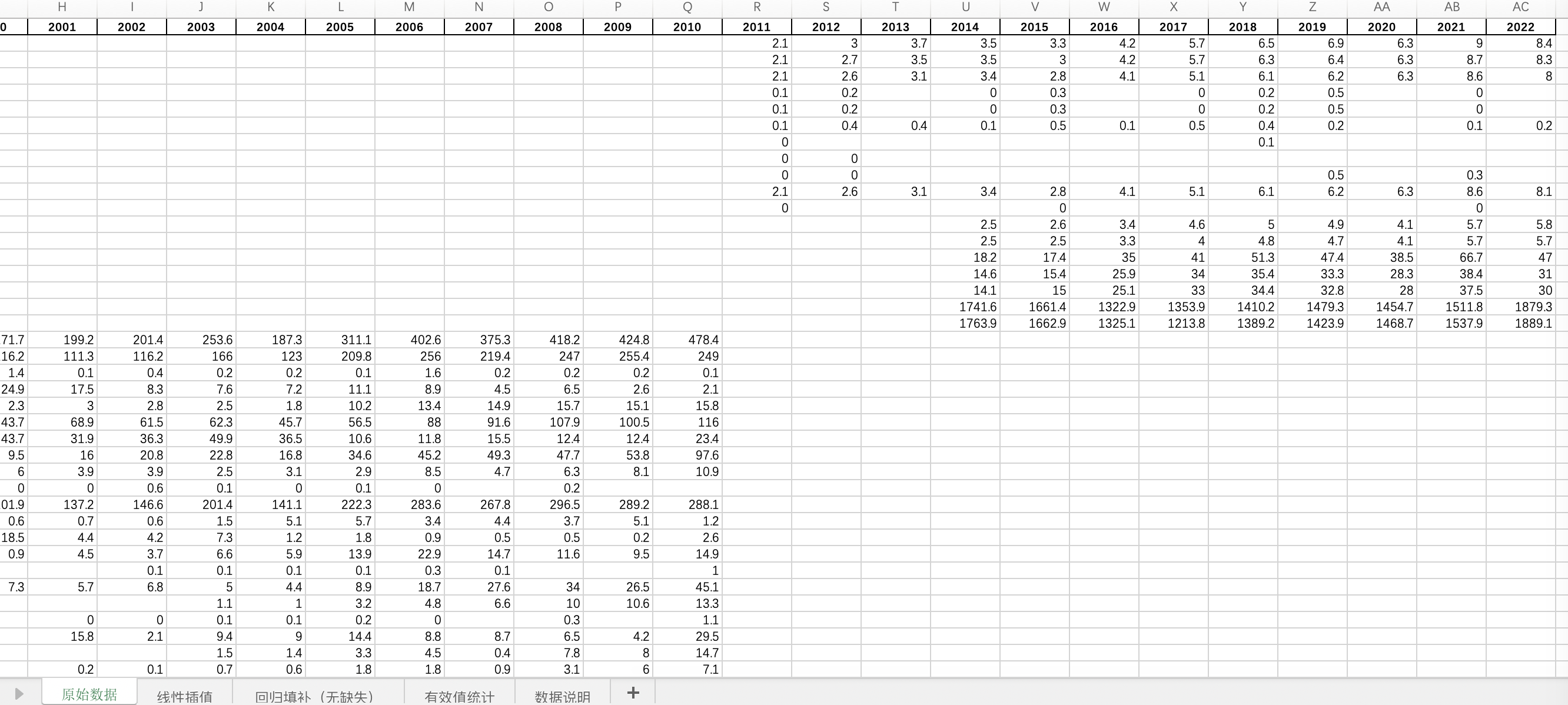 注意:我们把横跨23年年鉴的不同指标数据都罗列出来了,而每年年鉴口径客观变化情况,原始数据中存在披露口径缺失,其余非数据缺失,而是该年鉴口径没有统计。故提供线性插值及回归填补无缺失版本。