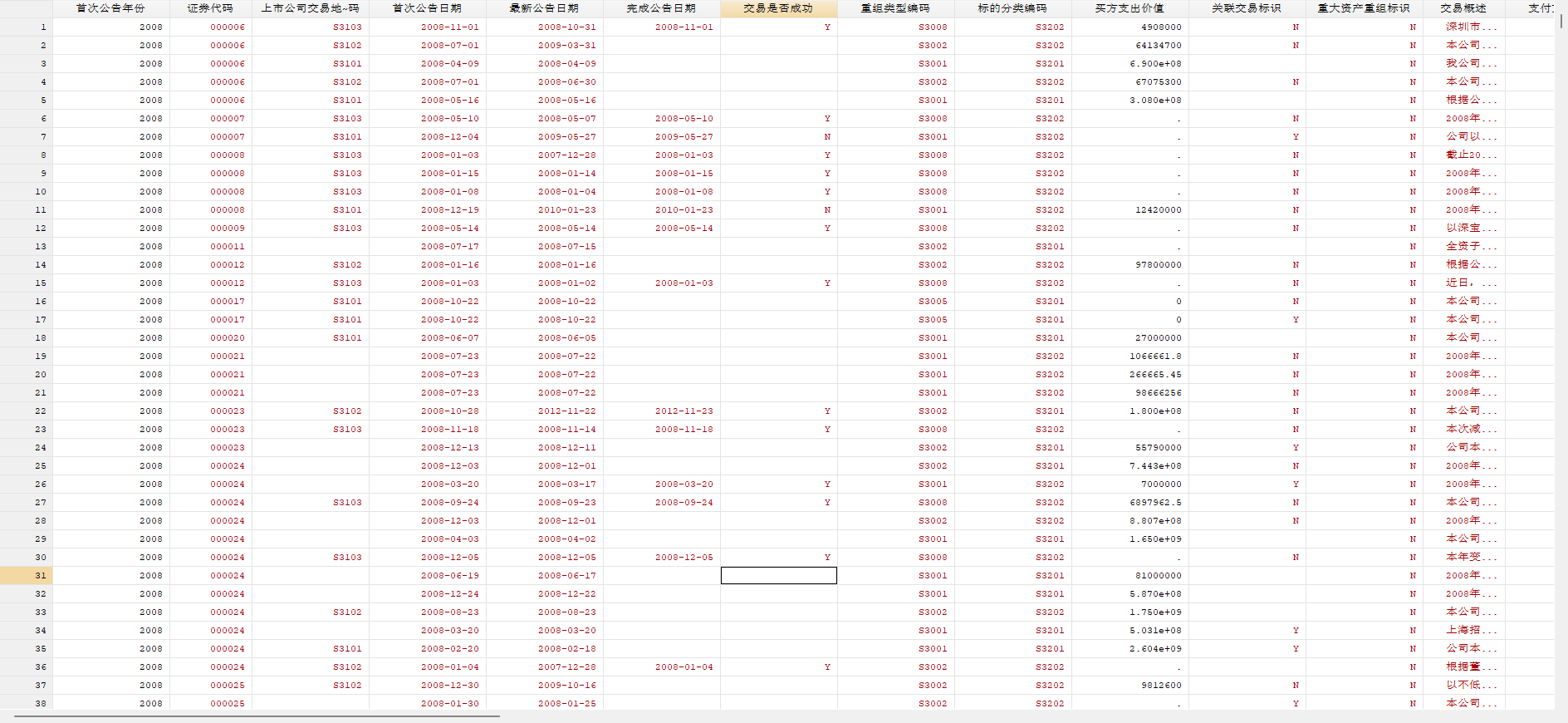 RestructuringTypeID [重组类型编码] - S3001=资产收购;S3002=资产剥离;S3003=资产置换;S3004=吸收合并;S3005=债务重组;S3006=股份回购;S3007=要约收购;S3008=股权转让