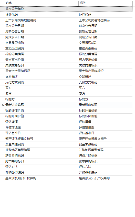 BusinessID [业务编码] - 由14位组成,前四位为首次公告日年份,加上6位证券代码,加上类型编码(A=资产、B=股权、C=要约收购、I=债务重组),加上三位自增长编码(同一年度,同一代码,同一类型编码下的自增长,如001、002、……)。