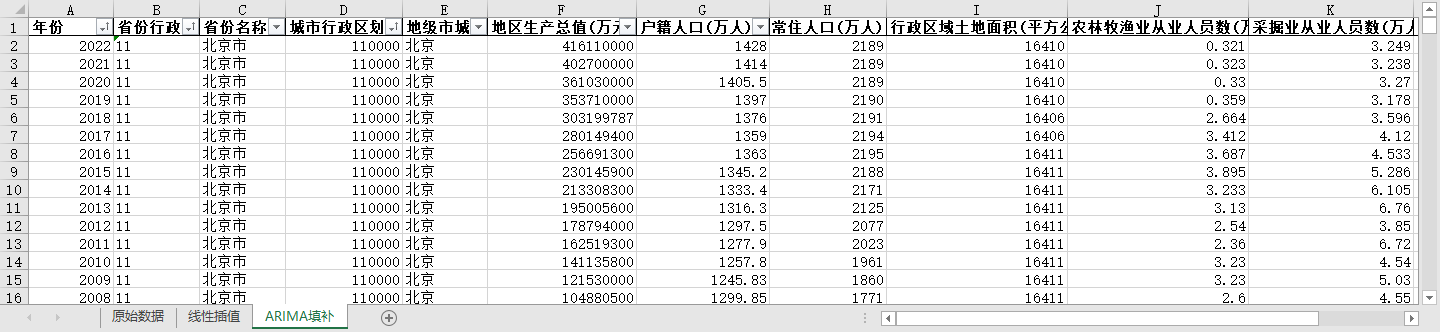 excel数据文件包原始数据(由于多年度指标不同存在缺失值)、线性插值、ARIMA填补三个版本,提供您参考使用。