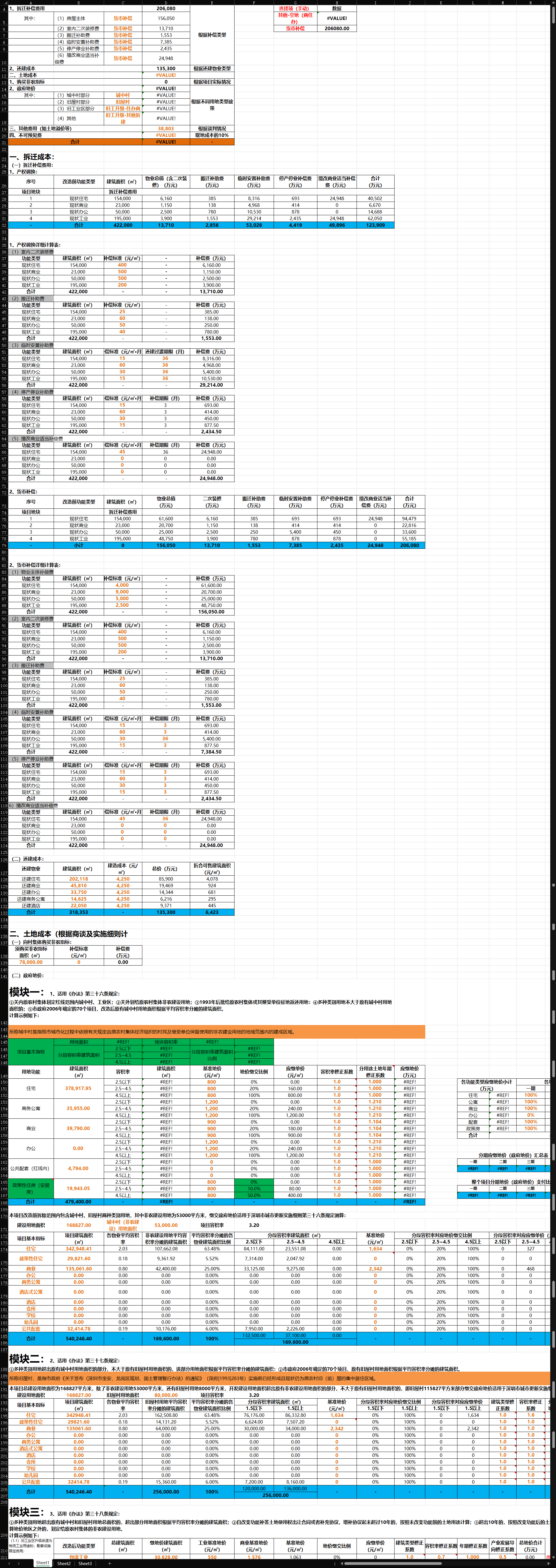 包含多个测算模块,测算数据取自于深圳市城市更新。