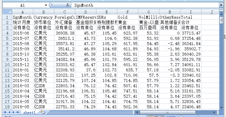统计月度 货币单位 外汇储备 基金组织储备头寸 特别提款权 黄金 黄金:以盎司计算的纯金数量 其他储备资产 合计