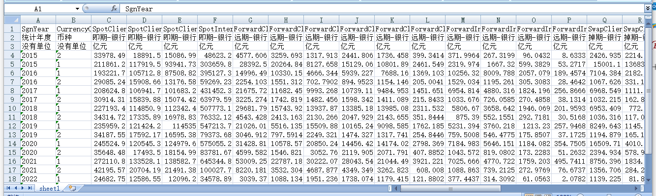 统计年度 币种 即期-银行对客户市场 即期-银行对客户市场-买入外汇 即期-银行对客户市场-卖出外汇 即期-银行间外汇市场 远期-银行对客户市场 远期-银行对客户市场-买入外汇 远期-银行对客户市场-卖出外汇 远期-银行对客户市场-3个月(含)以下 远期-银行对客户市场-3个月至1年(含) 远期-银行对客户市场-1年以上 远期-银行间外汇市场 远期-银行间外汇市场-3个月(含)以下 远期-银行间外汇市场-3个月至1年(含) 远期-银行间外汇市场-1年以上 掉期-银行对客户市场 掉期-银行对客户市场-近端换入外汇 掉期-银行对客户市场-近端换出外汇 掉期-银行间外汇市场 掉期-银行间外汇市场-3个月(含)以下 掉期-银行间外汇市场-3个月至1年(含) 掉期-银行间外汇市场-1年以上 期权-银行对客户市场 期权-银行对客户市场-买入外汇 期权-银行对客户市场-卖出外汇 期权-银行对客户市场-3个月(含)以下 期权-银行对客户市场-3个月至1年(含) 期权-银行对客户市场-1年以上 期权-银行间外汇市场 期权-银行间外汇市场-3个月(含)以下 期权-银行间外汇市场-3个月至1年(含) 期权-银行间外汇市场-1年以上 合计-银行对客户市场 合计-银行间外汇市场 合计-即期 合计-远期 合计-掉期 合计-期权