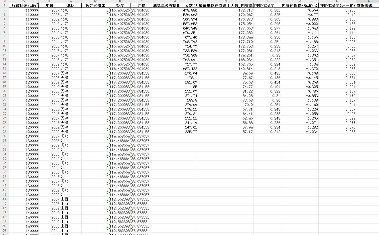 行政区划代码、年份、地区、长江经济带、经度、纬度、城镇单位、在岗职工人数、城镇单位在岗职工人数_国有单位、国有化程度国有化程度、国有化程度……