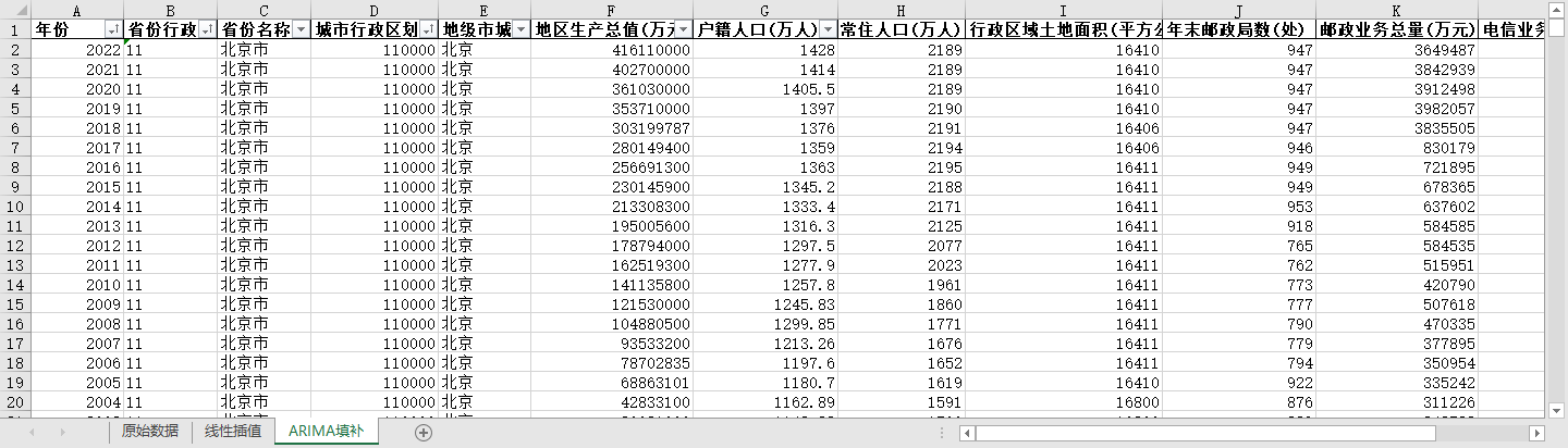 excel数据文件包原始数据(由于多年度指标不同存在缺失值)、线性插值、ARIMA填补三个版本,提供您参考使用。