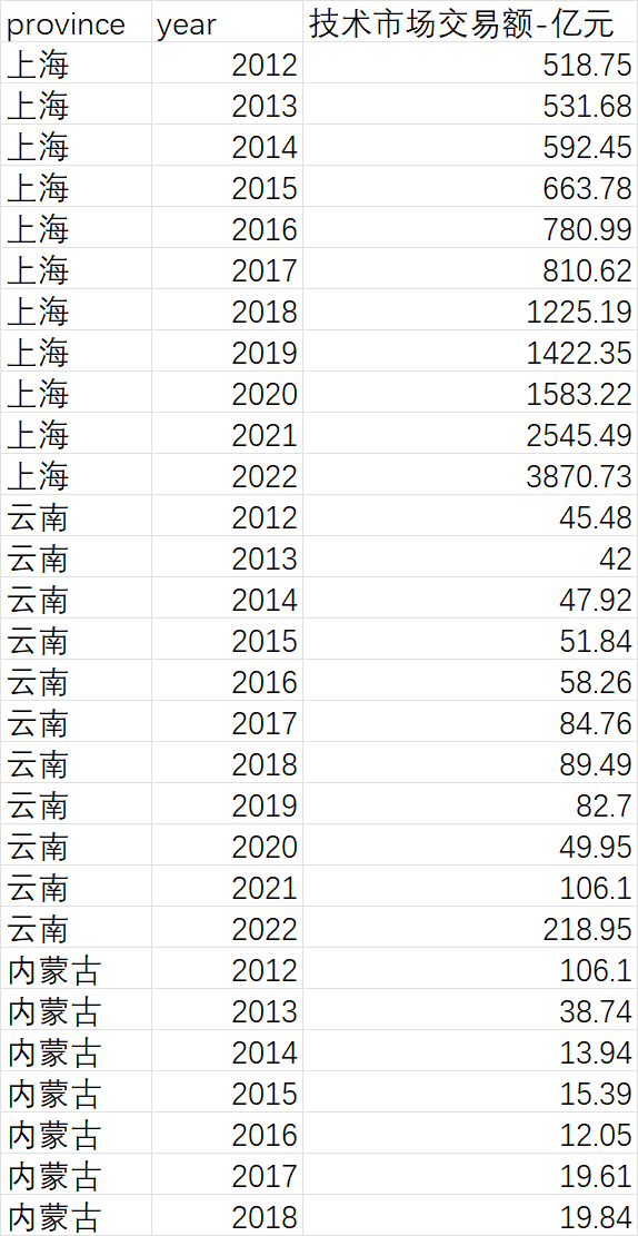 数据名称:各省份技术创新发展水平衡量指标12-22年技术市场交易额数据