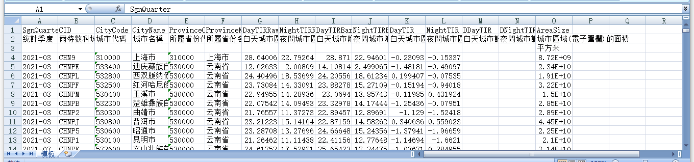 統計季度 爾特數科城市編碼 城市代碼 城市名稱 所屬省份代碼 所屬省份名稱 白天城市區域平均熱輻射 夜間城市區域平均熱輻射 白天城市附近5km範圍內平均熱輻射 夜間城市附近5km範圍內平均熱輻射 白天城市區域平均熱輻射-白天城市附近5km範圍內平均熱輻射 夜間城市區域平均熱輻射-夜間城市附近5km範圍內平均熱輻射 白天城市調整熱輻射同期變化 夜間城市調整熱輻射同期變化 城市區域(電子圍欄)的面積
